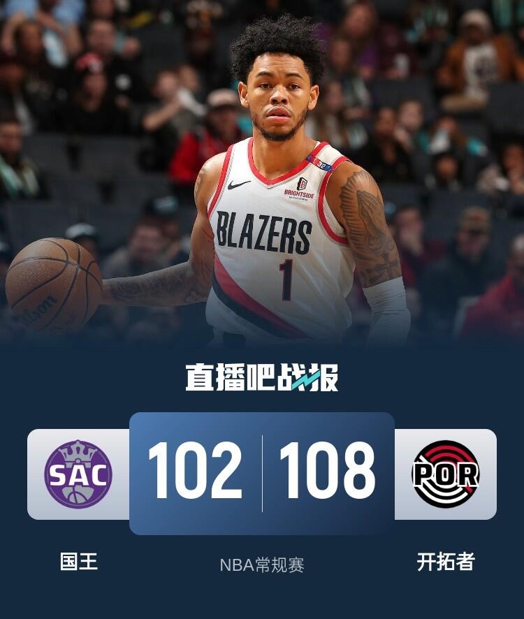 上半场,夏普首节独得10分,国王多点开花给出回应,次节双方继续缠斗,比分始终紧咬,安芬尼-西蒙斯得分助攻一肩挑,半场战罢开拓者54-50领先国王。下半场,国王率先发力反超比分,开拓者回敬10-2的攻击波夺回优势,末节双方争夺陷入白热化,关键时刻开拓者内外开花确立优势,国王苦苦追赶无果。最终,开拓者108-102击败国王,取得6连胜。