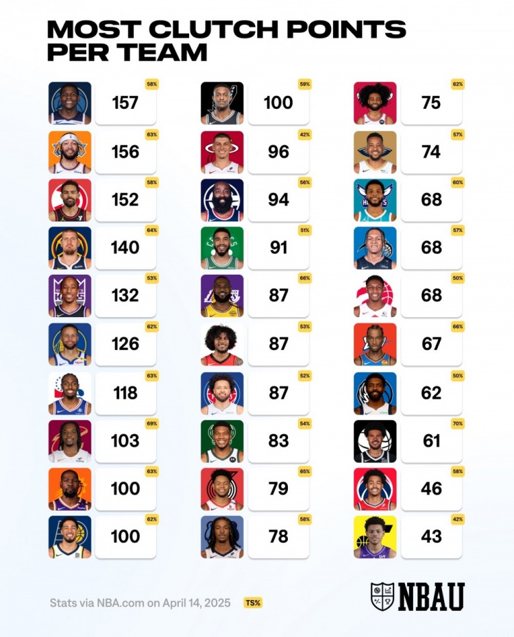4月15日讯 今日,数据媒体NBA University晒出了本赛季各球队关键时刻的得分王。