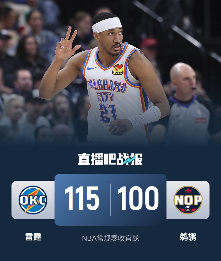 一开场,雷霆率先发力打出11-2的开局,鹈鹕不断冲击篮筐连投带罚拿分,雷霆内外开花一举将分差拉开到20分,鹈鹕及时回暖完成10-0的攻击波缩小分差,半场战罢雷霆64-49领先鹈鹕15分。下半场,鹈鹕奋力反击继续迫近比分,雷霆轰出15-4的进攻高潮稳住局势,末节雷霆稳扎稳打,鹈鹕大势已去无力回天。最终,雷霆115-100轻取鹈鹕,客场取胜收官。