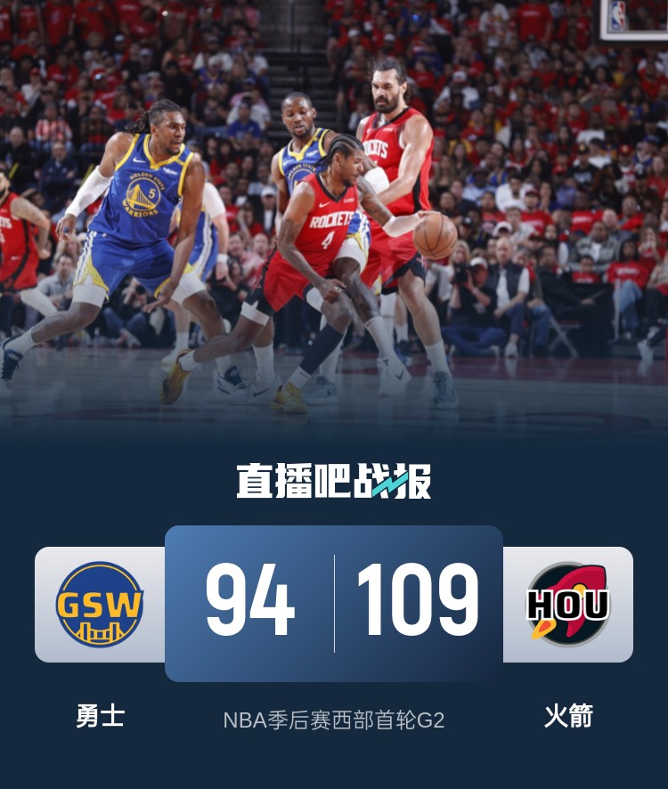 4月24日讯 NBA季后赛今日继续开打,火箭坐镇主场迎来和勇士系列赛的G2之战,首战勇士客场先拔头筹击败火箭总比分上1-0取得领先。