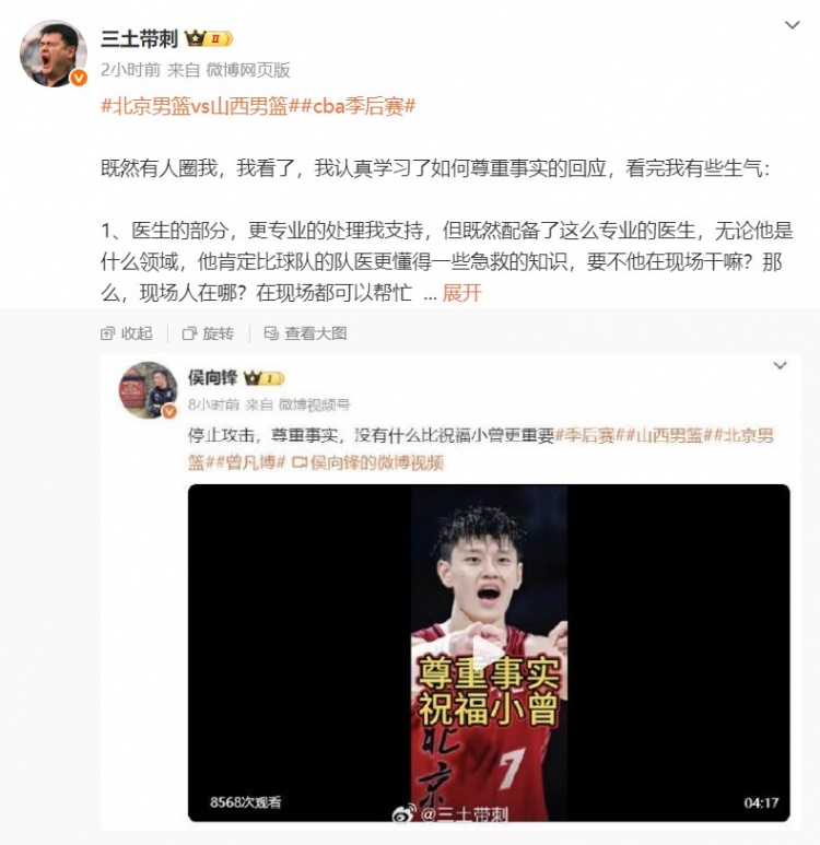 5月2日讯 今天,媒体人@三土带刺 在社媒上谈到了山西省篮协副主席侯向锋对此前网友的一些评论进行的回应。