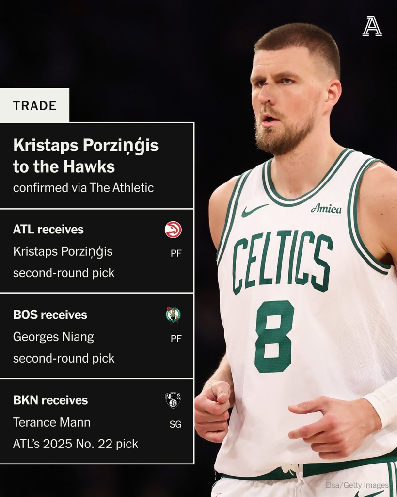 06月25日讯 据ESPN名记Shams报道,多位消息人士透露,凯尔特人、老鹰和篮网敲定一笔三方交易,将波尔津吉斯+次轮签送去老鹰。