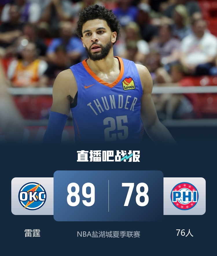 一开场,双方很快陷入缠斗,比分始终紧咬,76人内外开花,雷霆轮番冲击内线连投带罚给出回应,次节两队依旧打得难解难分,雷霆持续发力打出6-0的小高潮,76人里突外投迅速追赶,托皮奇连续罚球帮助雷霆半场43-38领先76人。易边再战,雷霆外线开炮保持优势,奥斯丁反击得手将分差拉开到两位数,席菲诺三分止血,末节雷霆一波7-0扩大优势,明茨暴扣打成2+1,但雷霆稳扎稳打将优势保持到最后。最终,雷霆89-78击败76人。