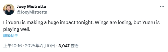 赛后,飞翼跟队记者和媒体都发文称赞李月汝的表现——跟队记者Joey Mistretta:李月汝今天发挥出巨大作用。飞翼输了,但李月汝打得很好。