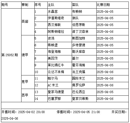传足胜负彩第25052期竞猜赛事为英超、德甲、意甲和西甲赛事,由于下周中欧冠、欧联和欧协联1/4决赛陆续开打,不少豪门将连续一周双赛,需要小心提防。