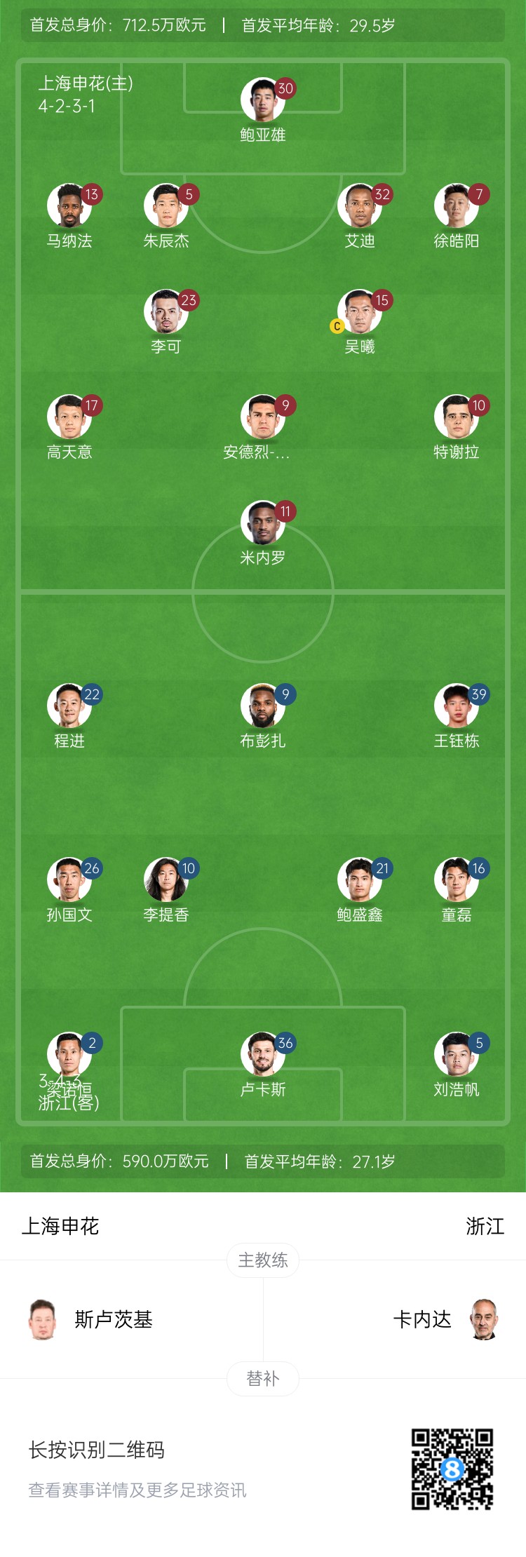 04月12日讯 北京时间20点,中超第6轮,上海申花主场迎战浙江,赛前双方公布首发。