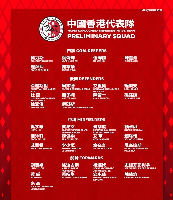 将出战亚洲杯预选赛,中国香港队37人初选名单:10人来自中超中甲