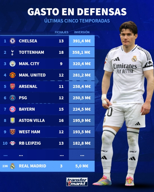 05月15日讯 据德国足球转会市场网站统计,过去5个赛季中,皇马在后卫引援上仅花费了500万欧元,在世界足坛中排名第236。