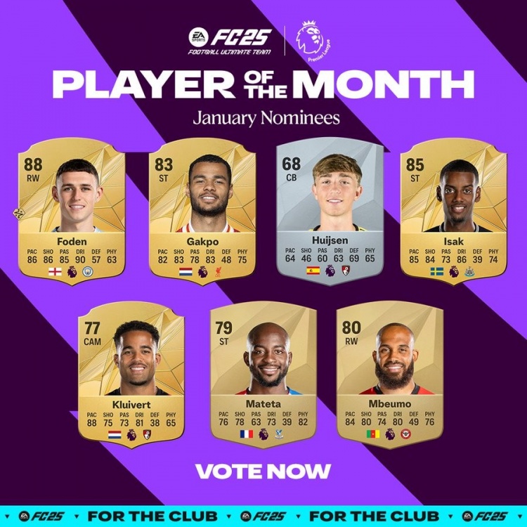 英超官方公布1月最佳候选7人名单:福登、加克波、伊萨克领衔