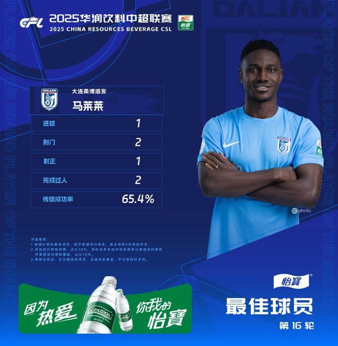 连媒:马莱莱当选中超当轮最佳,英博队史首次有球员获此荣誉